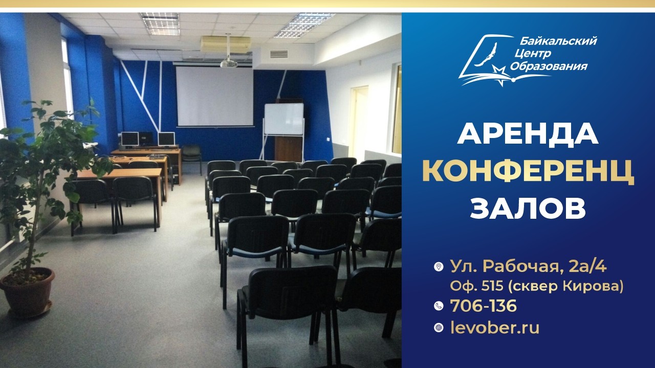 Для проведения обучения нашими столичными тренерами сотрудников Администрации г. Иркутска и Иркутской обл. было необходимо помещение в шаговой доступности от места работы. Выбрали большой конференц-зал УЦ Байкальского Центра Образования на Рабочей 2А/4 , обучающиеся остались довольны комфортными условиями во время занятий, просторно, климатические условия отличные. Будем продолжать сотрудничать, отличная система лояльности к клиентам.