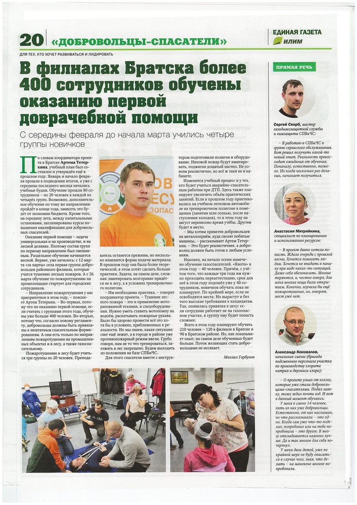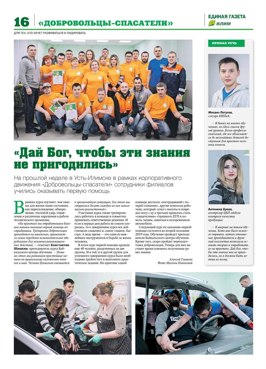 В феврале в городе Первоуральске состоялось традиционное обучение по оказанию первой помощи пострадавшим! Наша группа была новичками, а мы впервые проходили такое обучение, так как в этом году только вступили в ряды добровольцев-спасателей. Это направление на нашем заводе — добровольцы-спасатели — должны хорошо знать основы оказания первой помощи, основы пожарной безопасности и быть внутренними аудиторами для того, чтобы травматизм на нашем предприятии стремился к нулю и не было несчастных случаев, были минимизированы все риски. Обучение прошло на высоте, очень много было практики. Преподаватель рассказывал теоретический материал и сразу же закреплял его на практических примерах. Мы накладывали жгуты, бинты, учились делать перевязки, транспортировать пострадавших не только с помощью носилок, но и с применением подручных средств, проигрывали разные практические ситуации, оказывали сердечно-легочную реанимацию, работали в парах, маленьких командах, мини-командах, работали поодиночке. Курс понравился выше всяких похвал! С нетерпением ждём этого тренера на следующий год также к нам для проведения обучения. Спасибо огромное Байкальскому центру образования и нашему руководству! Я под впечатлением, мы под впечатлением и рассказываем своим семьям, своим родным и близким, показываем сразу, пока знания еще свежи, как нужно действовать, так как эти курсы и знания нужны не только для работы, но и для повседневной жизни. Мы занимаемся активно туризмом, часто ездим отдыхать в горы, для нас это было нереально актуально. Спасибо!