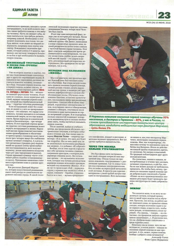 Отзыв о курсе оказание первой помощи пострадавшим самый хороший! Спасибо большое учебному центру БЦО, что всегда отправляете к нам заинтересованных хороших тренеров! Очень понравилась подача материала, все наглядно и доступно! Привезли как всегда много оборудования с собой, учились делать перевязки, транспортировали друг друга, оказывали СЛР и многое другое. Были получены ответы на все наши вопросы! Хотелось бы увеличить количество часов по курсу! Спасибо, ждем осенью!