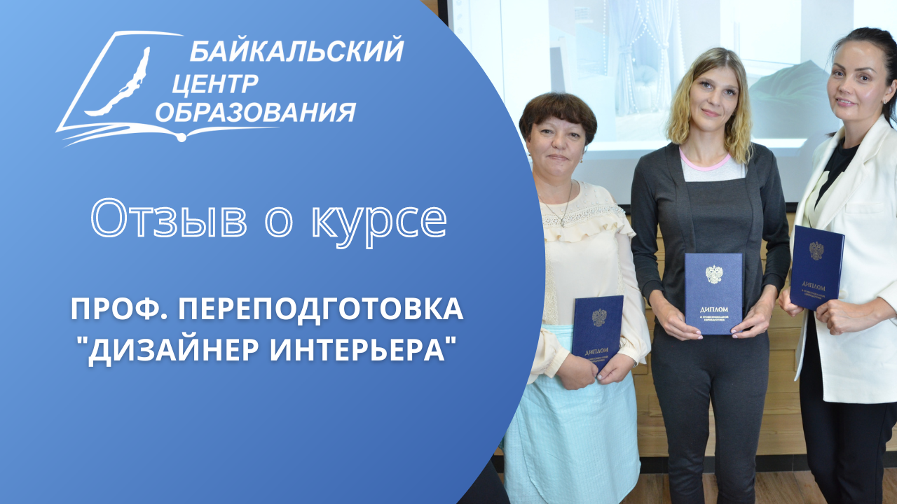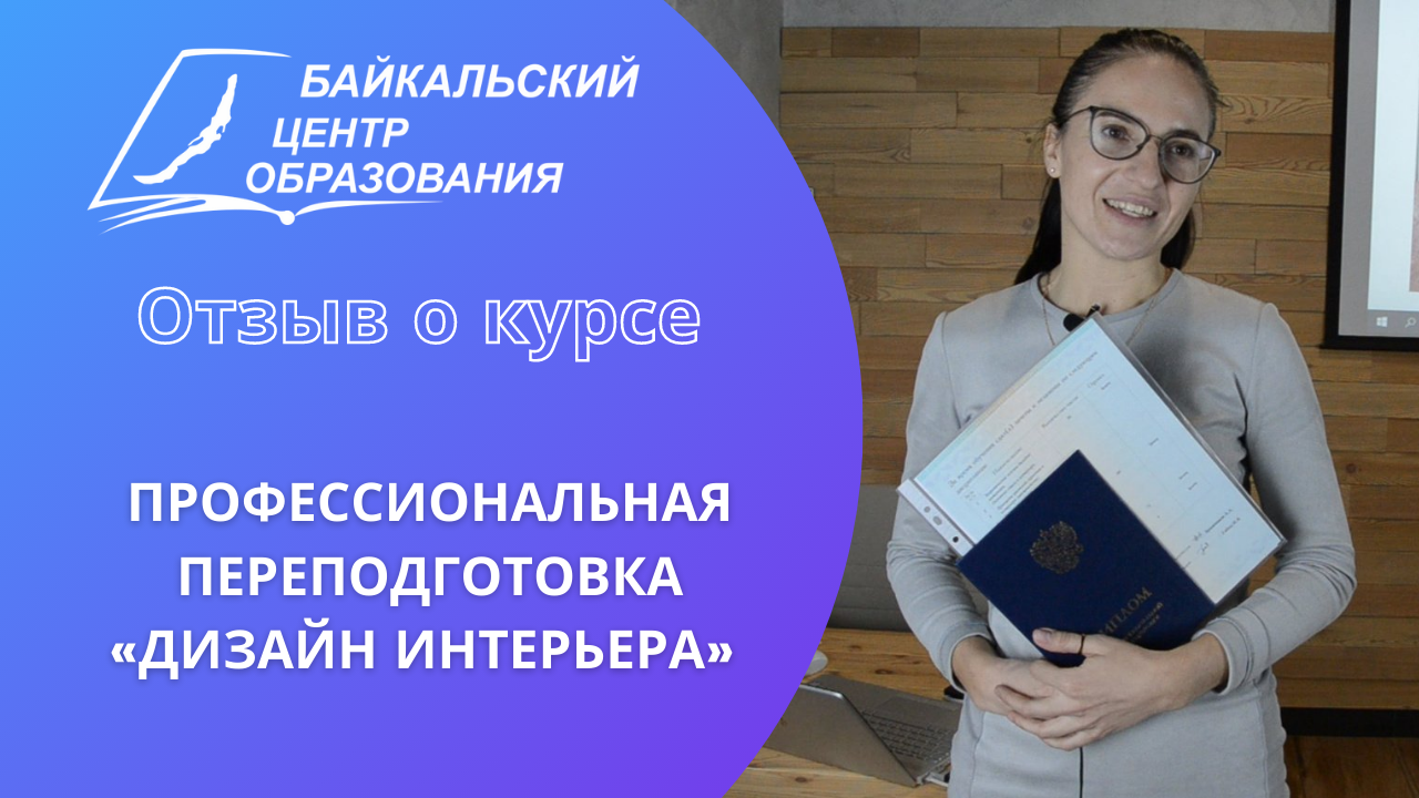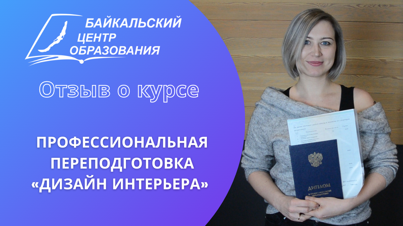 Курс "Дизайн интерьера". Выражаю большую благодарность в повышении навыков и профессиональной переподготовки по программе "Дизайнер интерьера" коллективу "Байкальского Центра Образования", желаю большого роста самых высоких наград на уровне города, области, страны… СПАСИБО Вам!!!